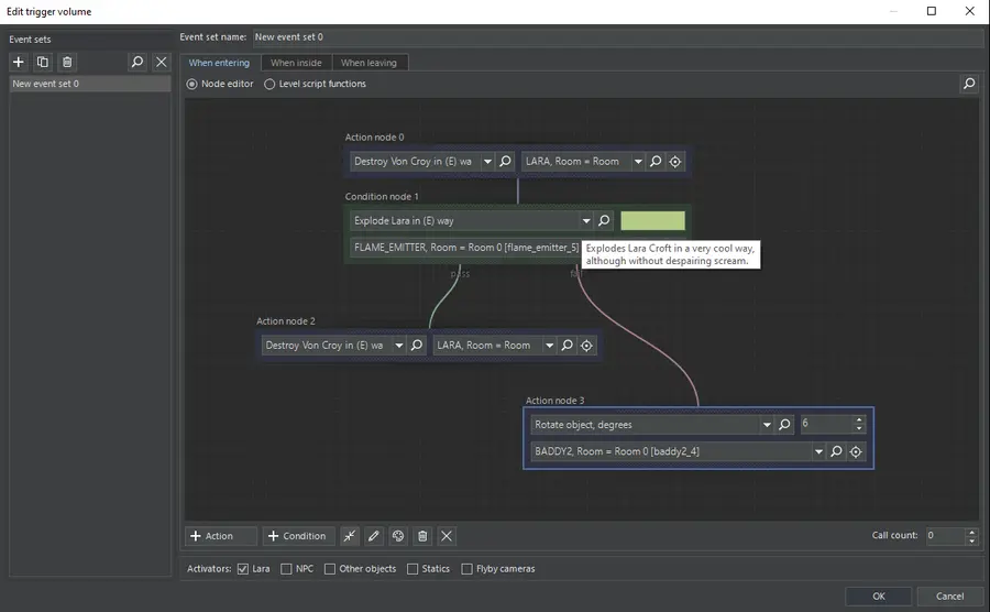 Zusätzlich soll aber wohl auch die alte Möglichkeit bestehen bleiben, weiterhin Funktionen mit Programmiercode in die Lua Level Datei zu schreiben, um sie normal mit Volume Triggern aufrufen zu können.