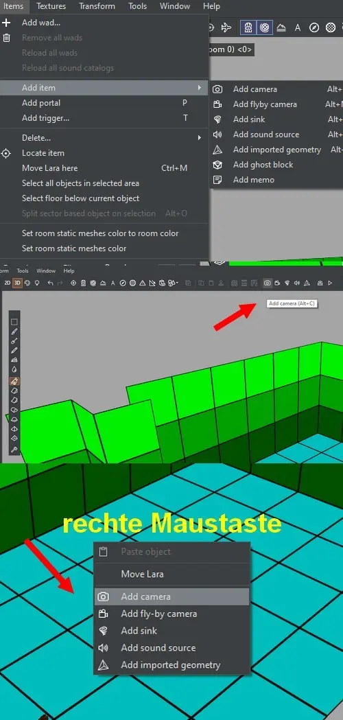 1. In der Menüleiste unter Items > Add Item > Add Camera.