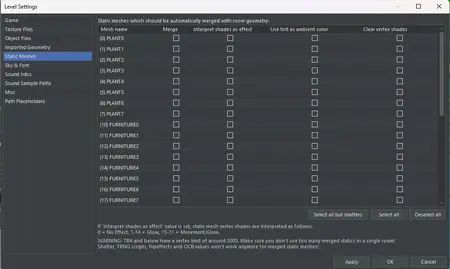 Mit dieser Funktion kann man Static Meshes mit der Raum Geometrie verschmelzen.. Die Static Objekte werden auch bzgl. Raumlicht wie Wände und Moveables behandelt. Also die Beleuchtung verteilt sich passend und man muss keine Beleuchtung der Static Objekte setzen. Den wer kennt das Problem nicht, dass man manuell ein Licht der Objekte anpassen muss, gerade weil somit durch ein Light Bulb/Sun ein Verlauf der Lichter entsteht. Dieses wird natürlich nur an die Raum Geometrie weiter gegeben, aber nicht an Static Objekte.