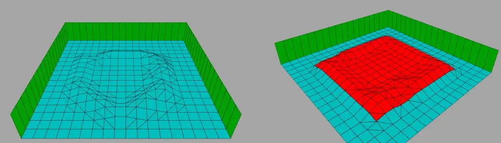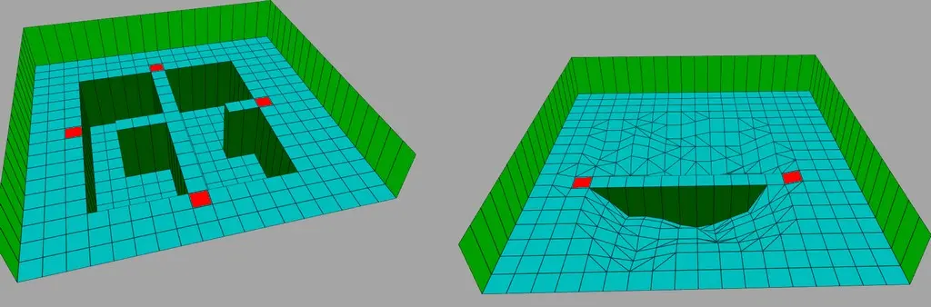 Hebt man den Boden und senkt die Decke auf dem gleichen Square, kann man jeweils nur so weit erhöhen bzw. senken bis sich 2 Punkte treffen. Dadurch gibt es keine falschen Überschneidungen mehr so wie beim alten Editor. Man kann immer nur so weit anheben oder senken bis der Boden auf die Decke und andersherum trifft. (siehe Bild)