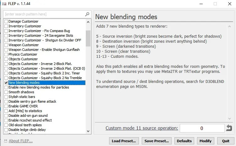 Anmerkung. Bevor man Veränderungen im Spiel sehen kann, muss man zuvor noch die Tomb4.exe mit Flep und der entsprechenden Einstellung gepatcht haben.