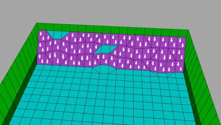 Anzeigen von Slopes, auf denen Lara herunterrutschen würde. Ab einer Senkung oder Steigung von 3 Klicks rutscht Lara auf diesen Squares herunter. Die Squares werden durch weiße Richtungspfeile auf Lila Hintergrund dargestellt.