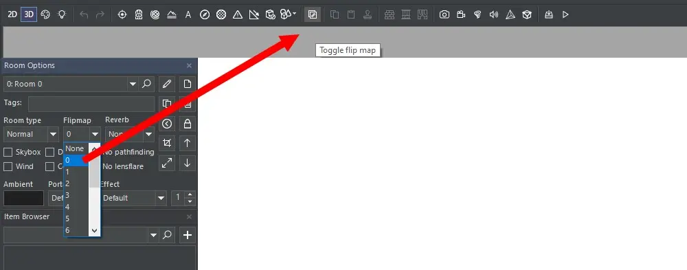 Um einen geflippten Raum zu erstellen gehen wir unter "Room Options" auf Flipmap (None) und klicken auf den weißen Pfeil, der nach unten zeigt. Nun haben wir die Möglichkeit eine Kopie des bestehenden Raumes zu erstellen und diesem eine Nummer zu vergeben (0-15). Diese Nummer brauchen wir nachher, damit wir den geflippten (veränderten) Raum durch einen Trigger auslösen können.