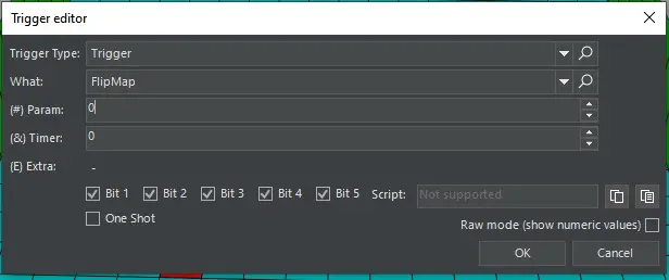 Um einen geflippten Raum nun zu triggern, setzen wir einen Trigger und wählen Trigger > Flipmap aus. Unter Param setzen wir die Nummer, die wir vergeben haben (0-15).