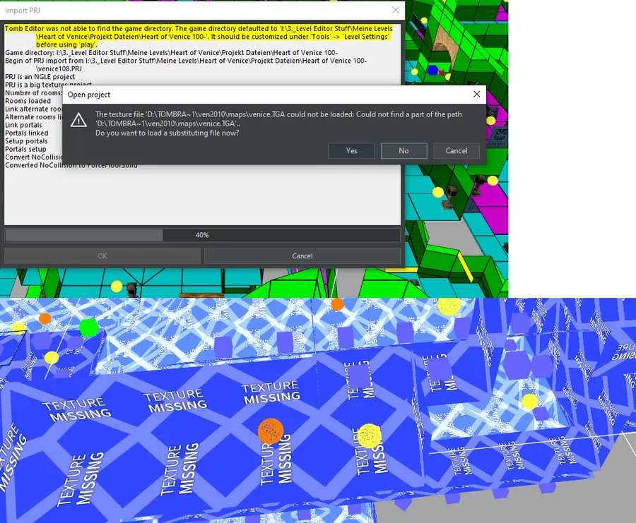 Meistens findet der Tomb Editor beim Laden von .prj2 und .prj Dateien sofort den richtigen Pfad zu den Texturen. Sollte dies einmal nicht der Fall sein, erscheint folgende Meldungen: