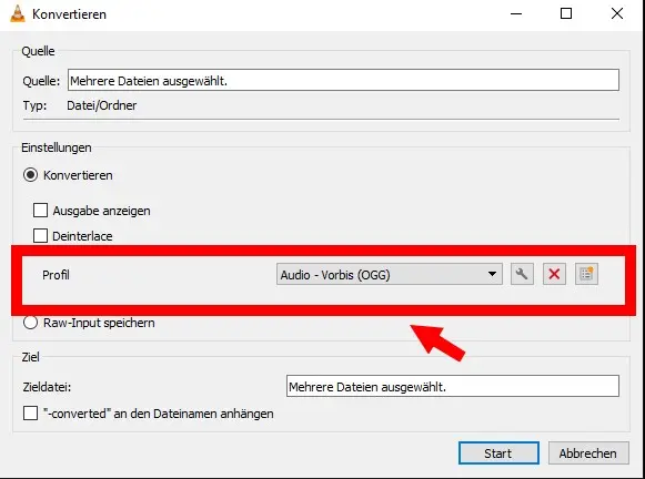 5. Unter Profil "Audio - Vorbis (OGG)" auswählen dann auf "Start" klicken