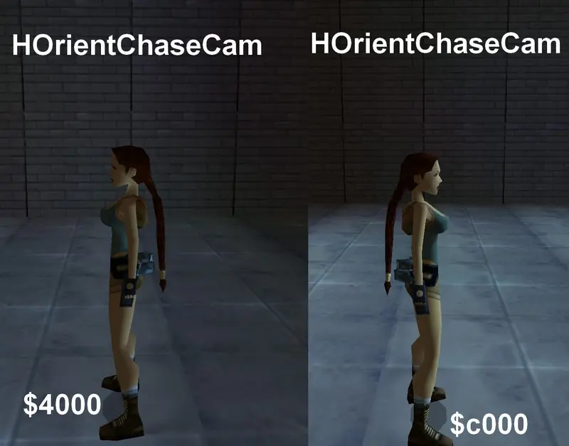 Bei zu großen Werten werden diese ignoriert. Beim Wert -32767 müsste man genau in Laras Gesicht schauen, aber mit Lara kopfüber. Dieses verhindert aber die Engine und deswegen erhält man den gleichen Wert wie -16384, also mit Blick genau auf Laras Kopf.