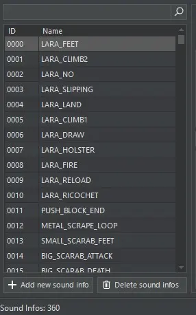 Nachdem wir in Sound Tool eine sounds.txt, eine .sfx- oder .xml Datei geladen haben, finden wir im linken Fenster die gesamte Liste, so wie wir sie auch in der reinen Sounds.txt finden. Normal müssten das 360 Sounddateien sein.