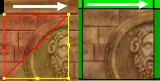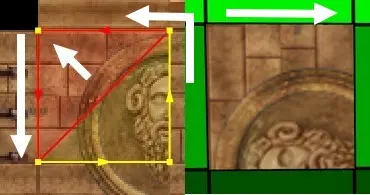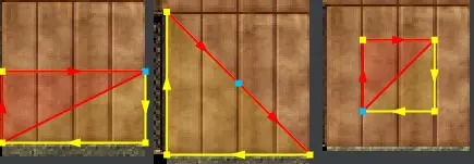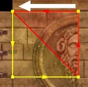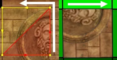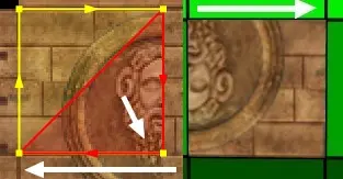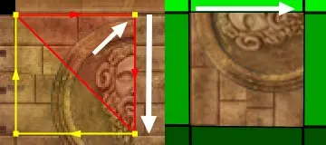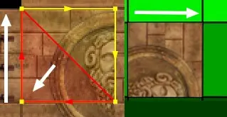 Mit der Shift- + linke Maustaste ändert sich der ausgewählte Bereich innerhalb der Textur nicht, das heißt der unterteilte Bereich in rotes und gelbes Dreieck bleibt immer gleich. (Dieser wird wichtig, wenn wir ein Square oder eine Wand texturieren wollen, die in ein Dreieck unterteilt ist.)