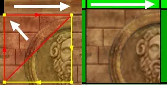 Wählen wir im Tomb Editor eine Textur aus (egal ob 64, 128, usw. Pixel) erhalten wir um die Textur einen Rahmen mit gelben und roten Pfeilen und jeweils 4 gelbe kleine Quadrate an jeder Ecke.