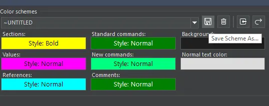 Daneben erscheint ein Diskettensymbol. Wenn wir dieses anklicken, können wir die neue Farbzusammenstellung mit "Save Scheme as..." abspeichern und einen Namen vergeben wie z.B. (My own scheme).