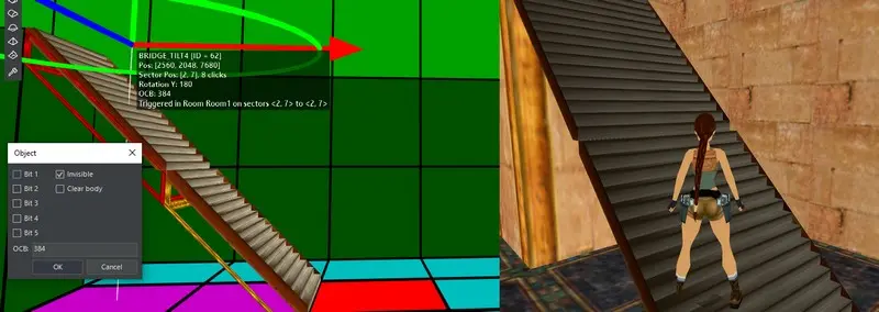 Klickt man bei Bridge Objektes im OCB Menü auf "Invisible" sind sie unsichtbar und man kann sie im Zusammenhang mit Statics nutzen, um Dinge zu simulieren. (Bsp. Steile Treppe)