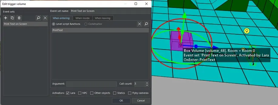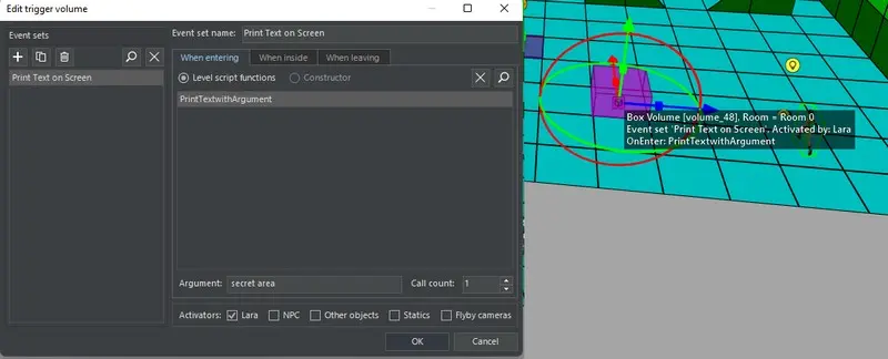 Dann lassen wir die Funktion "LevelFuncs.PrintText" durch einen Volume Trigger im Spiel auslösen: