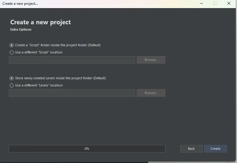 Hier geben wir an, ob unsere Projektdateien, die der Tomb Editor beim Speichern erstellt (.prj2 Format) in einem Ordner innerhalb des Projektes erstellt werden soll, oder ob wir einen gesonderten Ordner unter "Browse" angeben. Für diese Einstiegsserie nehmen wir ebenfalls die Standardeinstellung, die einen Ordner innerhalb des Projektes erstellt.