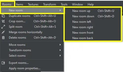 Unter "Rooms > New Room" können wir schnell angrenzende Räume schaffen, die miteinander verbunden sind (Portals).