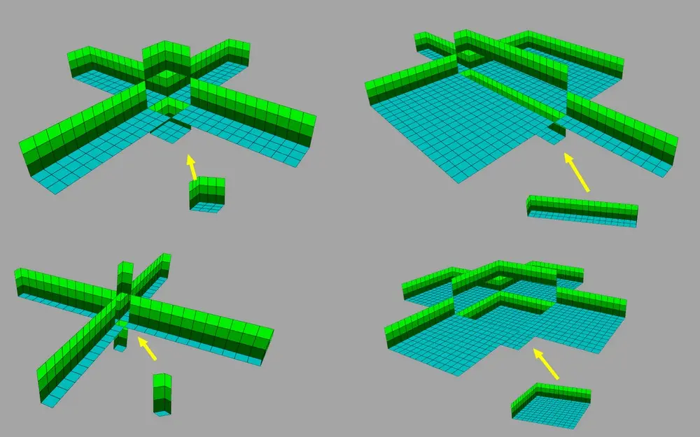 Zum Schluß einige Beispiele von unterschiedlichen Raumgrößen, bei denen von jeder Seite und oben und unten ein Raum automatisch mit "Rooms > New room" verbunden wurde.